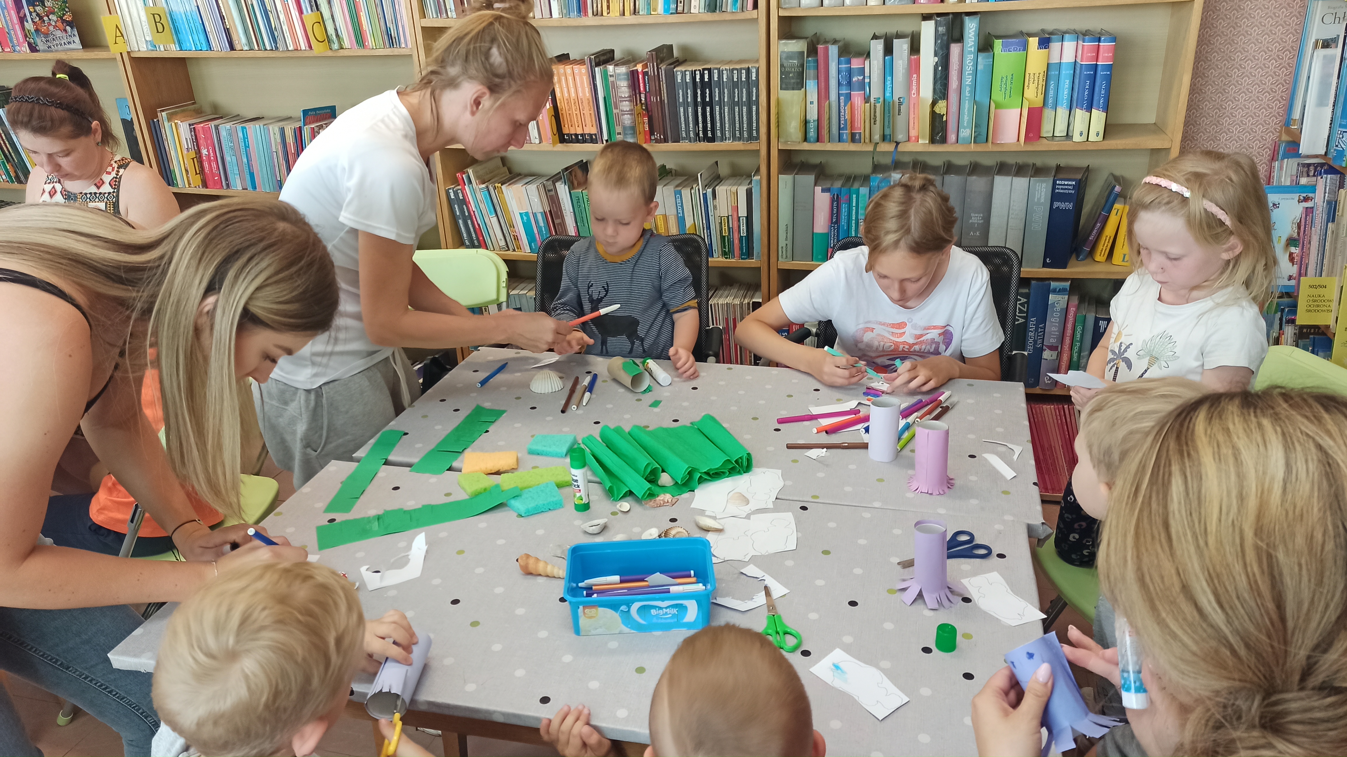 W czwartkowe południe gościłyśmy rodziny z Bydgoszczy na kolejnych zajęciach z cyklu "Odkrywcy podwodnego świata". Podczas dzisiejszych zajęć uczestnicy poznali przygody dzielnej ośmiornicy Zośki z powieści Katarzyny Boni. Następnie wszyscy wykonywali elementy flory oraz fauny występujących w morzach i oceanach. Każde dziecko stworzyło kilka rybek, ośmiornic, gąbek i wodorostów, które ozdobiły wcześniej przygotowane przez panie bibliotekarki akwaria. Efekt pracy młodych odkrywców mile nas zaskoczył , dlatego uczestnicy spotkania zostali poinstruowani jak wykonać podobne akwarium samodzielnie w domu (przybyłe rodziny otrzymały wszelkie potrzebne materiały) .